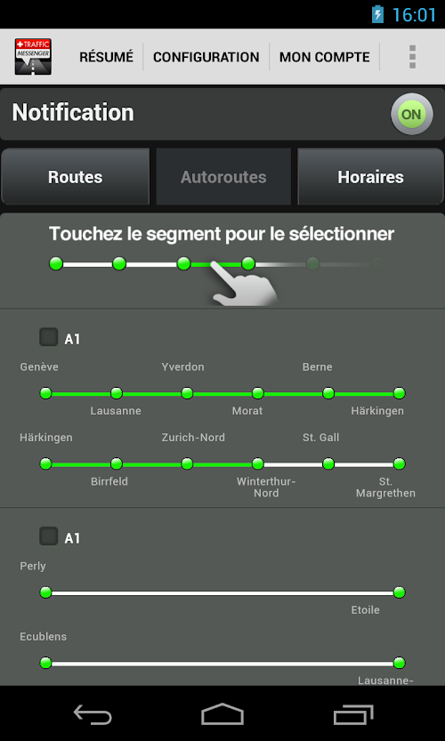 You want to know if there are caps on Geneva, Zurich or elsewhere in Switzerland. Nothing is easier! Configure the application to inform you plugs, accidents, slowdowns and work at times that suit you!