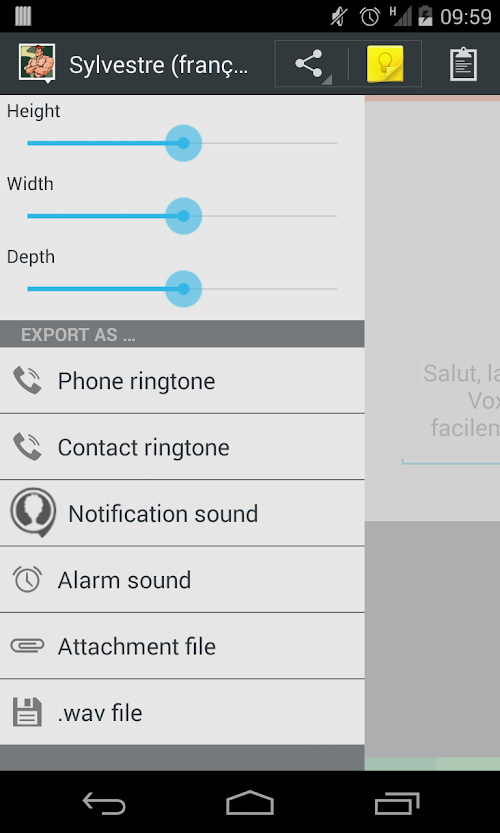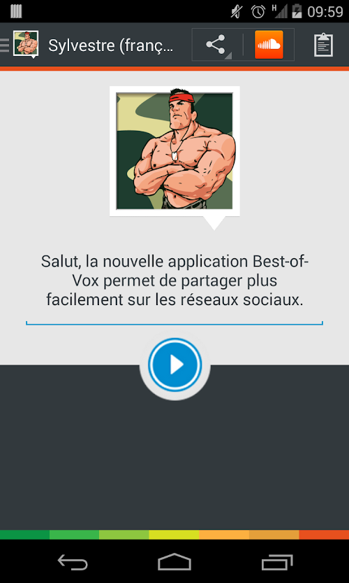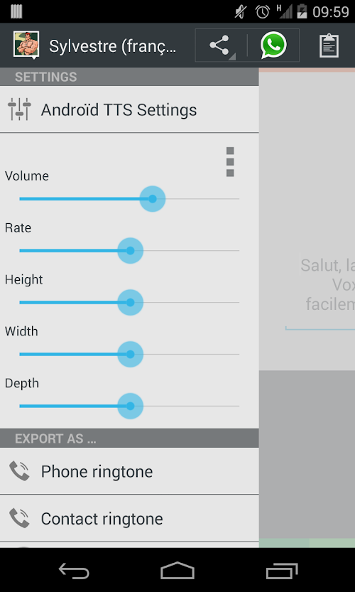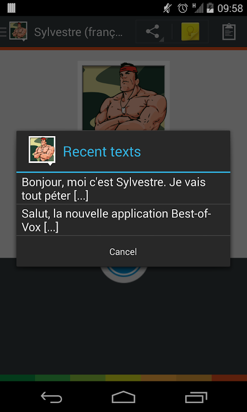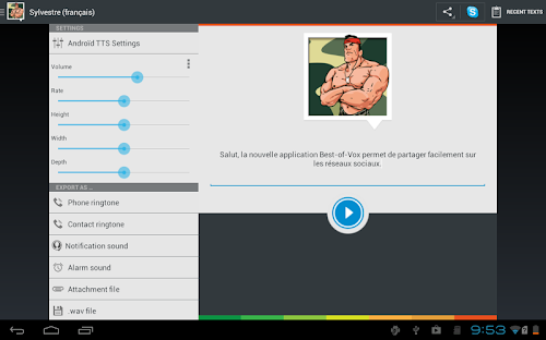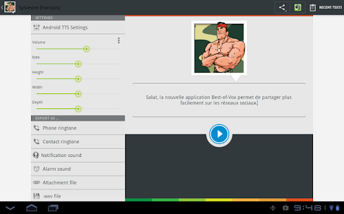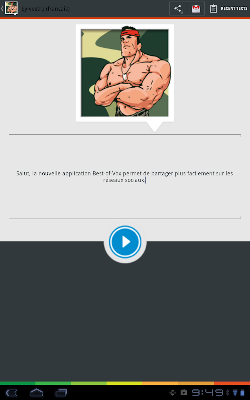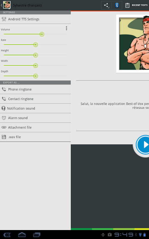 The Best-of-Vox application allows you to type or paste text and to have it read out aloud by the voice that you have chosen. You can then save it as a ringtone or share it with your friends on SoundCloud !