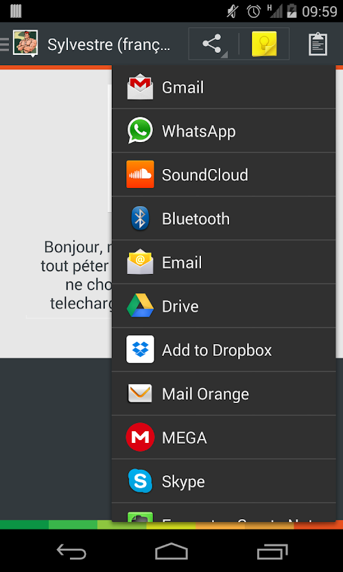 Share your messages from the Best-of-Vox application on your preferred social networks: SoundCloud, WhatsApp, Skype, hubiC, Evernote, Drive, etc.
