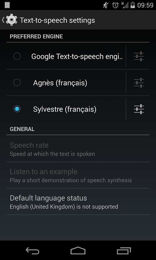 Only 2 clicks to activate the Best-of-Vox voice in the Android settings that you reach from the application's main menu. Watch the installation video and follow the instructions. Please note: with Android versions prior to 4.0, one additional first click is required at the bottom of the settings list in order to activate the voice.