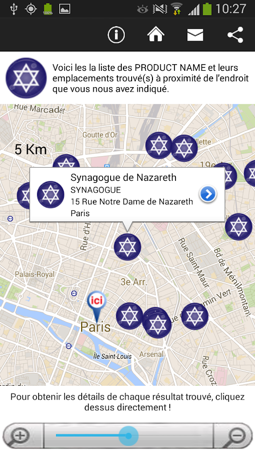 The SYNAGOGUE application is indispensable to find the nearest synagogue to you. No matter what country you are in, open the SYNAGOGUE application, place yourself on the map or enter the address of your choice and find the nearest synagogue. You can choose between seeing synagogues around you on a map or a complete list of these synagogues, with their addresses, telephone numbers and the distance that separates you from them.