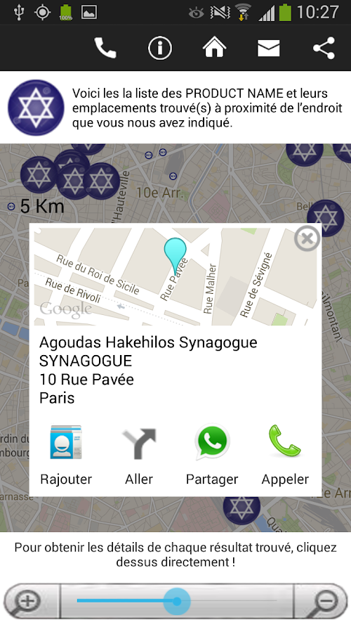 Once selected the synagogue, you can see the itinerary, or share information.