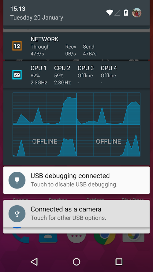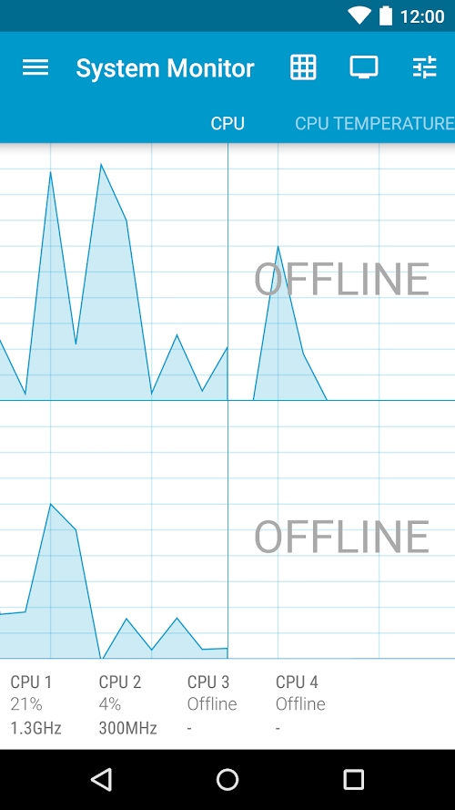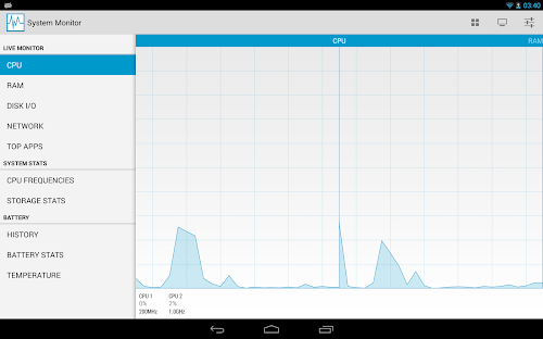 - Monitor total CPU usage or individual CPU cores (if your device has more than 1 CPU core).