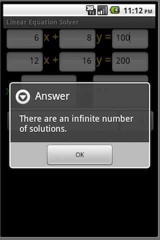 This app will solve a system of linear equations for x & y. It will give solutions for x & y, or tell the user when there are no solutions or an infinite number of solutions.