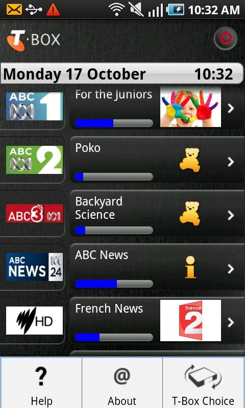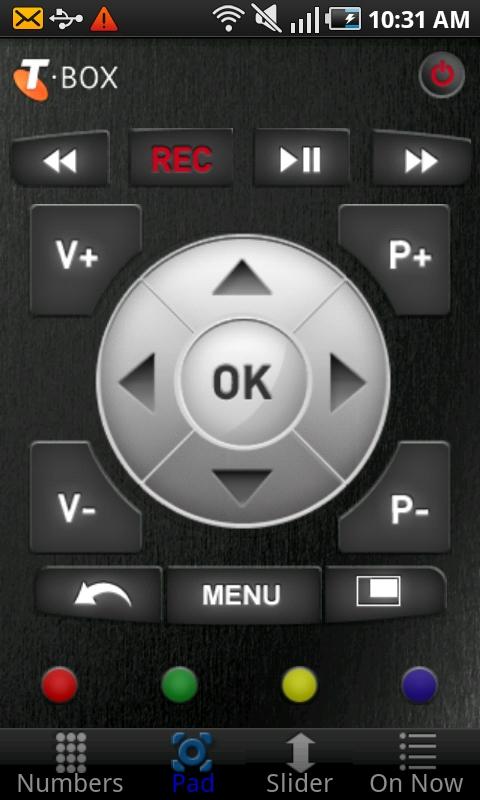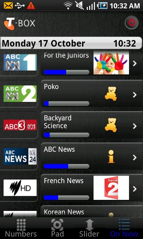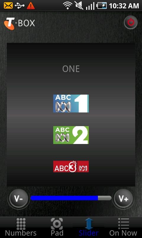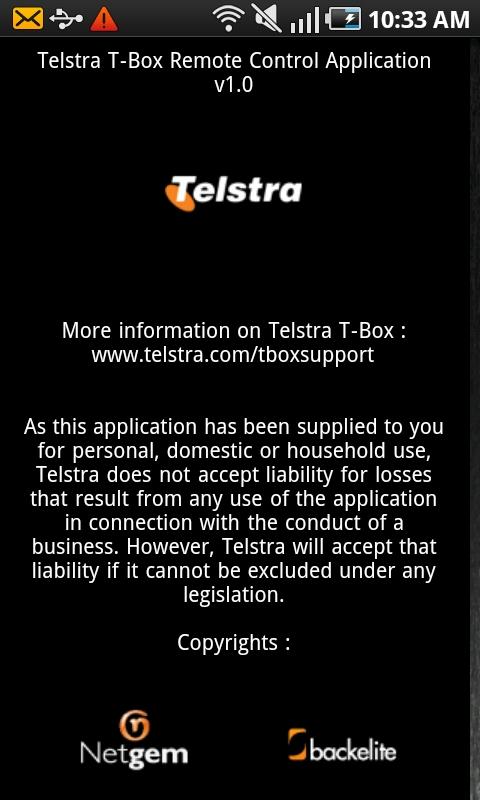 Telstra has created an Android application which acts as a remote control for the T-Box. It is a free, fun, easy-to-use app that turns your Android device into a remote control. You can control your T-Box wherever you can get access to your home network. Just like the T-Box remote control, the Android application can be used to change channels, control the volume, navigate menu items, etc. on your T-Box.