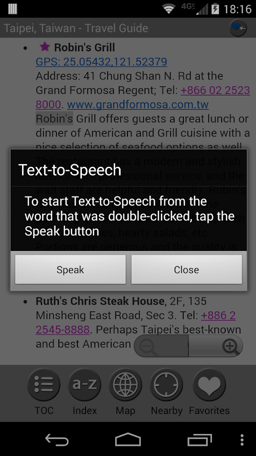 MobileReference Travel Guides provide detailed, practical information about attractions, landmarks, transportation, cultural venues, dining, lodging, history and much more. They are indexed alphabetically and by category, making it easier to access individual articles. Attractions can be viewed on an offline GPS map along with your current location so that you can easily find attractions near you as you explore the city.