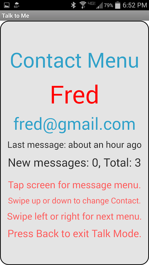 It allows you to ‘shake’ your device to enter ‘Talk Mode’ and from there, you can swipe different directions to change menus. It will talk to you and tell you where you are in the app so you don’t have to look at the screen. Perfect for driving (but please follow all local laws) as you do not have to look at the screen to listen or record a response!