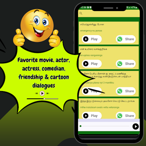 Tamil Comedy & Punch Dialogues app for Sharing Evergreen Super Hit dialogues from Tamil movies. Listed in Tamil and English to share with your friends in social media. The app includes the following artists.