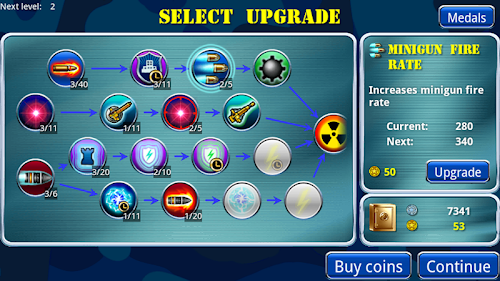Spend the coins between missions to upgrade weapons and protection of the base, and to improve special weapons as well!