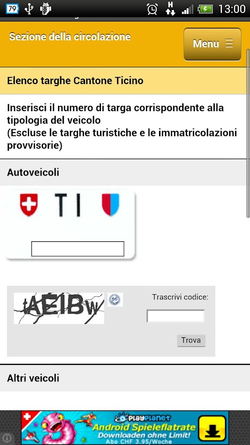 Per informazioni, segnalazioni e problemi non esitate a contattarci.Sick of having to open a browser and search for the right place to look for a plate of the Canton Ticino?
