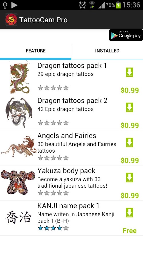 - 80++ tattoo designs pre-installed, can download more design using Store.