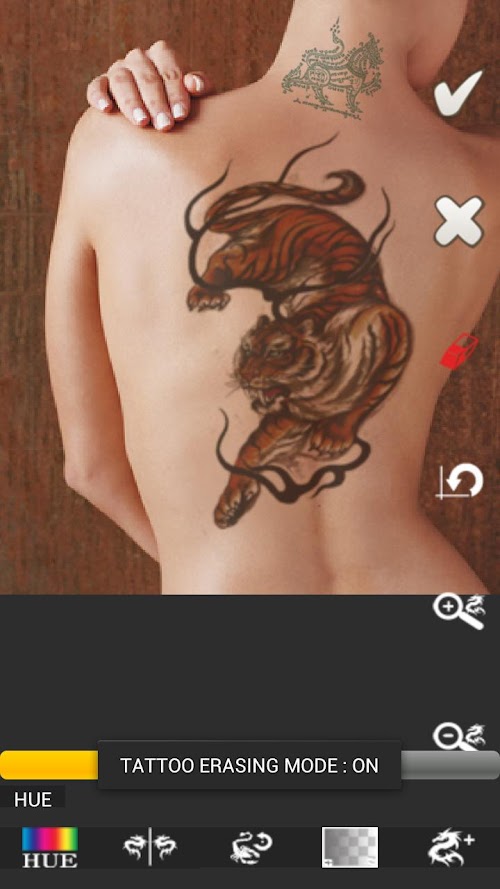 - Design your own tattoo by yourself. Choose tattoo, scale up/down the tattoo, make it translucent, rotate/flip and drag it to anywhere in the picture that you see fit.