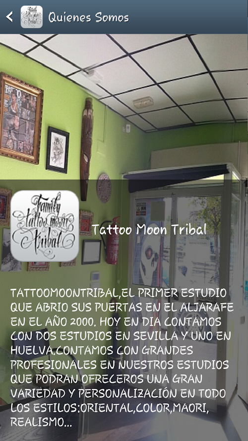 TATTOOMOONTRIBAL,EL PRIMER ESTUDIO QUE ABRIO SUS PUERTAS EN EL ALJARAFE EN EL AÑO 2000. HOY EN DIA CONTAMOS CON DOS ESTUDIOS EN SEVILLA Y UNO EN HUELVA.CONTAMOS CON GRANDES PROFESIONALES EN NUESTROS ESTUDIOS QUE PODRAN OFRECEROS UNA GRAN VARIEDAD Y PERSONALIZACIÓN EN TODO LOS ESTILOS:ORIENTAL,COLOR,MAORI,REALISMO...Mobile App Developed by Digizone Apps