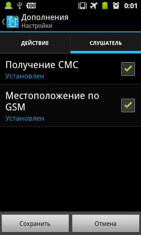 This extension allows you to run actions when you get an SMS. Possible filters specific telephone number and / or post. After receiving the SMS listener off. If you want this listener was on permanently, it is necessary to specify in Action this listener was included.