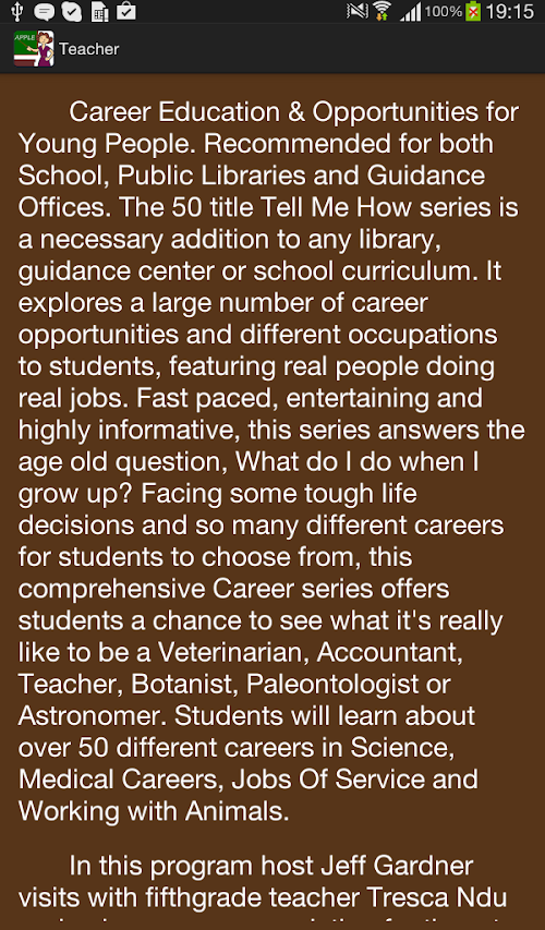 In this app host Jeff Gardner visits with fifth-grade teacher Tresca Ndu and gains a new appreciation for the art of teaching. He discovers the great dedication and patience required to become a number one teacher. Subjects Covered Include: What courses should you take to be a teacher? Do teachers ever stop learning? Do teachers take tests? Why is teaching a vital career? Is a college degree necessary to be a teacher? What makes a good teacher? Do teachers take the summer off? Why do teachers give homework? Why is listening important in teaching? Do teachers make a lot of money? Why are communication skills important to be a good teacher?