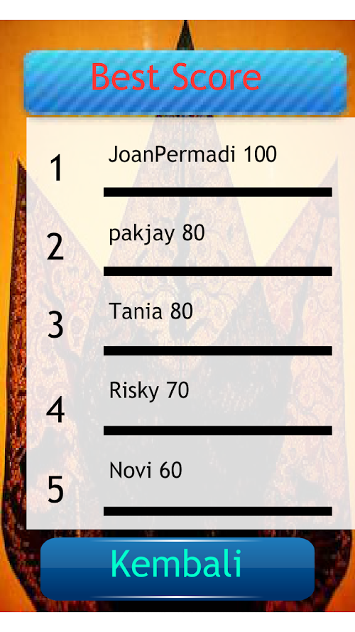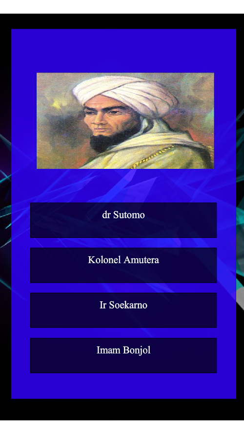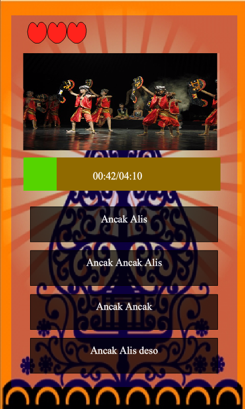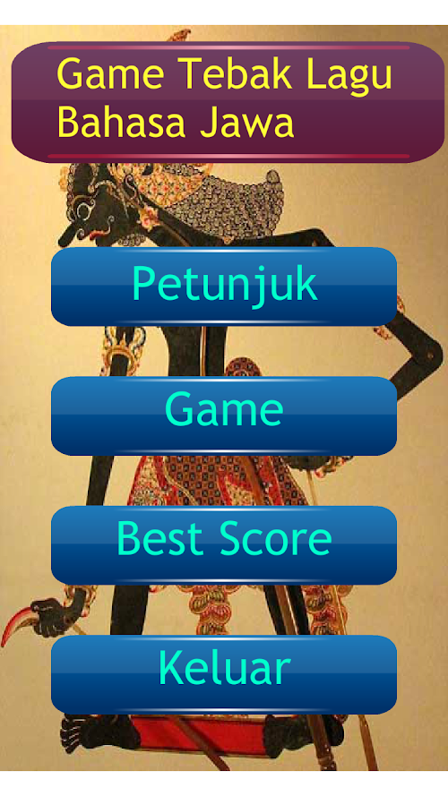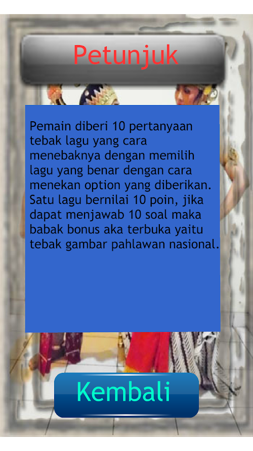 Aplikasi ini bertujuan untuk melestarikan kebudayaan Jawa, khusunya Jawa Tengah, aplikasi ini berisi tebak lagu bahasa jawa dan tebak gambar pahlawan nasional.This application aims to preserve the Javanese culture, especially in Central Java, this application contains the Java language guess the song and guess the image of national hero.