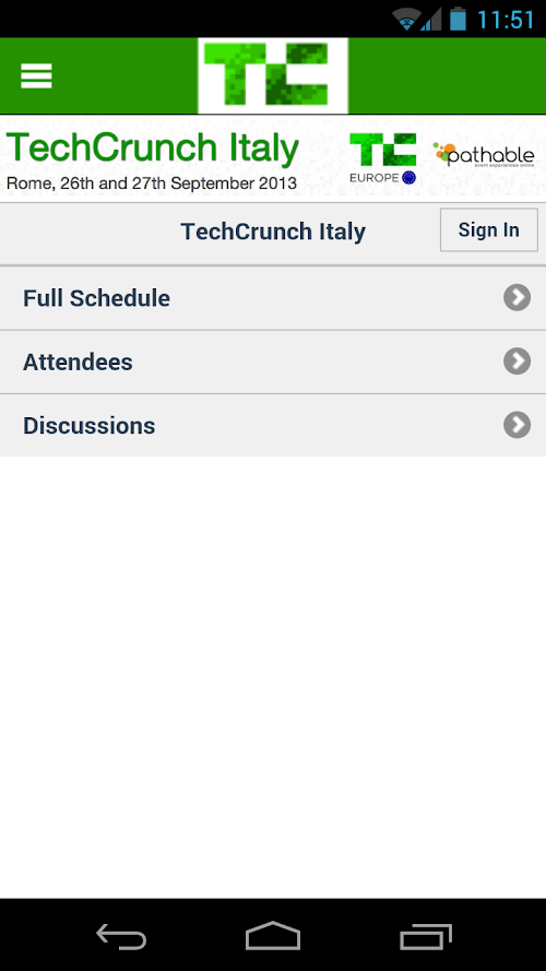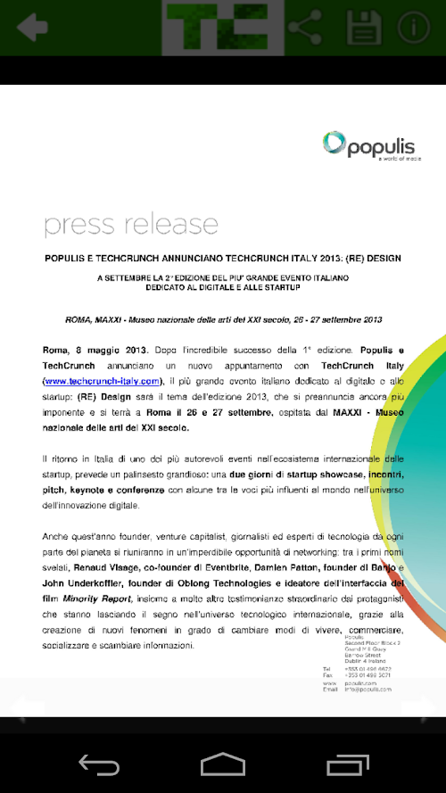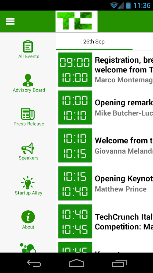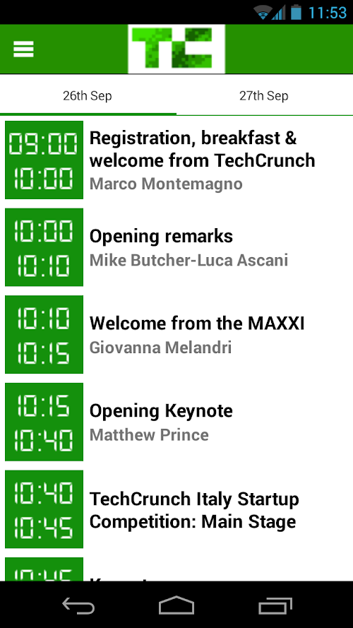 Official app for TechCrunch Italy 2013. Stay updated about the latest happening in TechCrunch Italy 2013 (26th – 27th September), the acclaimed 2-day tech event that will gather some of the most recognised leaders and innovators of the technology and media industries in Italy, Europe and the US. Check out the attendee list to find out more about the companies attending the event and learn more about sessions, schedules and speakers right on your device! Join the social community to receive real-time updates and find out how to apply for the startup competition and win a total prize of €50,000!