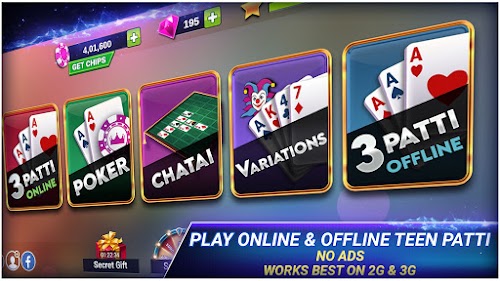 ● Game Modes: Classic Teen Patti Mode, Chatai Or Match3, Joker / Paplu, Muflis, AK47, JKQK.