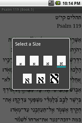 The Hebrew in Hand Traditional font, which can be viewed in seven sizes in this app, provides exceptional readability on any screen, whatever the resolution.