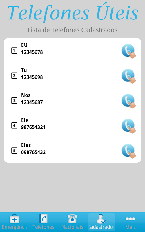 Você pode nos enviar números de telefone, sejam eles, de serviços, entidades, etc que são importantes para você ter disponível no aplicativo.