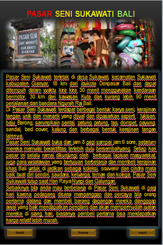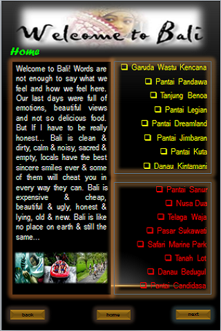Aplikasi Tempat Wisata Bali ini merupakan informasi online yang dapat diunduh oleh siapa saja dalam menentukan pilihan berwisata atau rencana liburan di Pulau Dewata. Pulau Bali atau juga dikenal sebagai Pulau Dewata merupakan icon negara Indonesia bagi negara-negara di dunia sebagai tempatnya para wisatawan yang memilih bali untuk dijadikan objek wisata. Aplikasi Tempat Wisata Bali ini mengupas tempat-tempat seperti :