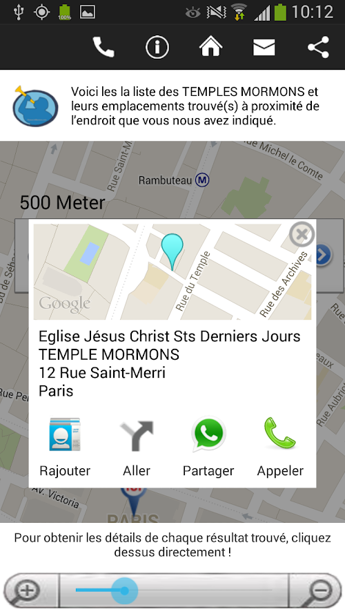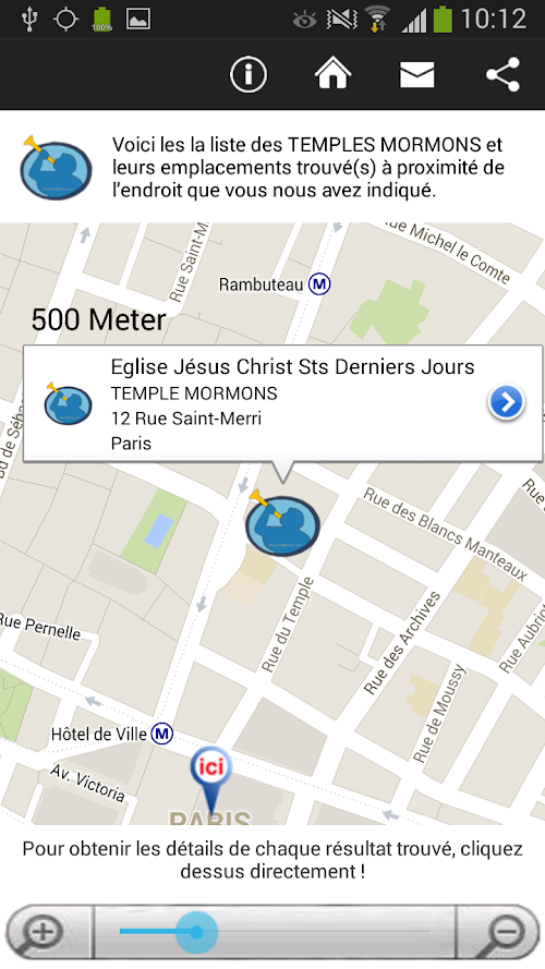 Une fois l’église ou le temple choisi, vous pouvez voir son itinéraire, ou bien partager ses informations.
