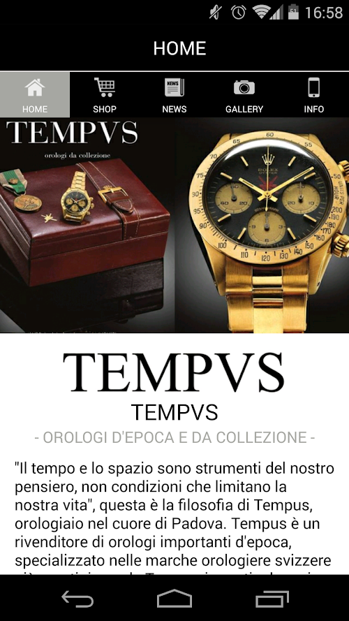 Con l'App Tempus Orologi Padova potrai avere a portata di mano tutto il catalogo di orologi di lusso quali Rolex, Patek Philippe e Cartier. Tempus vintage watches for years selects only the finest collectible watches to provide its customers with class, passion and precision of the time. "Time and space are tools of our thinking, not conditions that limit our lives," this is the philosophy of Tempus, a watchmaker in the heart of Padua.