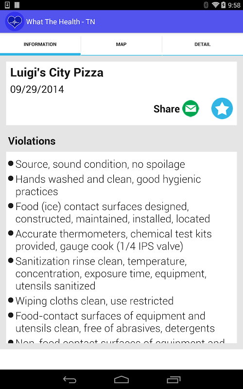 What The Health lets you easily view Health Inspection Scores for Restaurants, Hospitals, and Bar Establishments in the State of Tennessee. This multi-functional app allows you to quickly view Tennessee Health Scores for every Restaurant near you. Not only can you view Health Inspection Scores for restaurants in Tennessee, you can get directions and share scores with friends on Facebook!