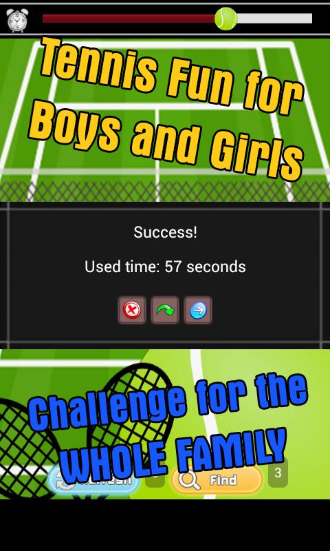 If you get stuck while playing the tennis games free apps, there is some help available for you along the way. Tap on the Refresh button, and the cool sports playing cards will be shuffled, so that you can find some more easy matches. The other option in these tennis games for free is to hit the Find button. This will find 3 absolutely free links for you, which can be very useful as the game progresses, and time runs out, with each round being 10 seconds shorter than the last round! All this while listening to fun tennis games sounds for free!