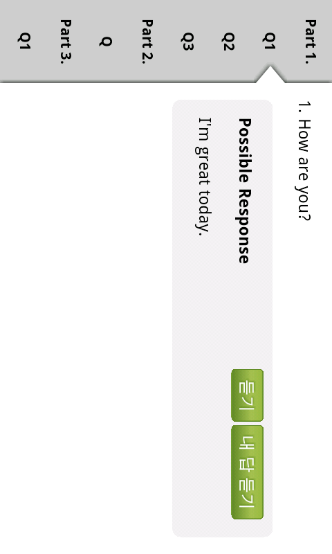 - 시험이 종료되면 메인 화면으로 돌아가 Review 메뉴로 들어가 '내 답 듣기'를 터치하여 각각의 질문에 자신이 답변한 내용을 들어봅니다. ‘듣기’를 터치하여 Possible Response의 스크립트를 보면서 원어민의 답을 듣고, 내 답과 비교해봅니다.