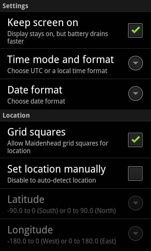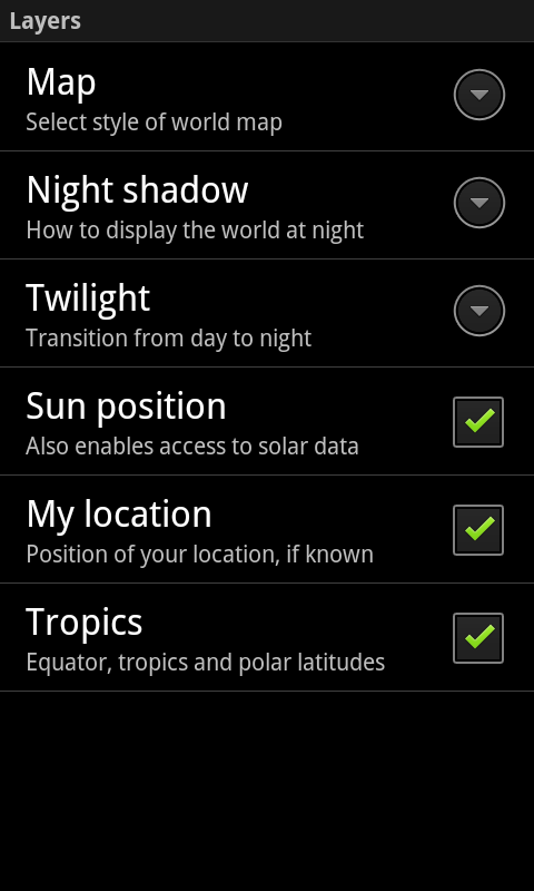 Click on location and sun icons to get exact location and sunrise/sunset times. Long click on the sun to retrieve real-time solar indices and solar disk image with sunspots.