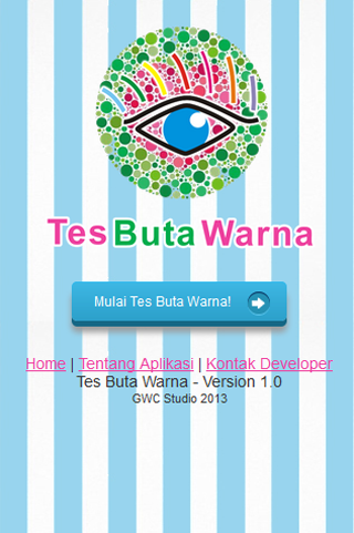 Aplikasi Tes Buta Warna ini bebas dan gratis untuk digunakan, selain itu aplikasi ini juga dapat digunakan tanpa menggunakan koneksi jaringan internet. Aplikasi ini hanyalah bentuk dari screening tes buta warna yang sesungguhnya. Aplikasi ini dapat Anda gunakan sebagai latihan dalam Tes Buta Warna sesungguhnya. Sumber gambar diambil dari beberapa sumber buku Ishihara yang tersedia di internet. Tersedia solusi bagi Anda yang di diagnosa Buta Warna di dalam aplikasi ini.Color Blind Test Application is an application that serves as a tool to determine whether a person is color blind or not. Application of color blindness is taken from Ishihara book that was first introduced by Dr. Shinobu Ishihara who worked as a professor at the University of Tokyo JAPAN and then Dr. Shinobu introduce this book in 1917 almost one hundred years ago.