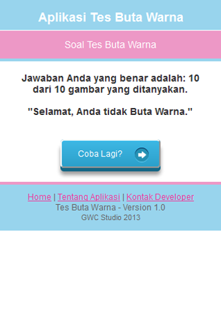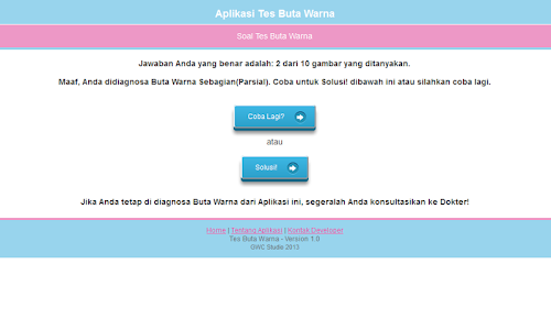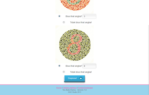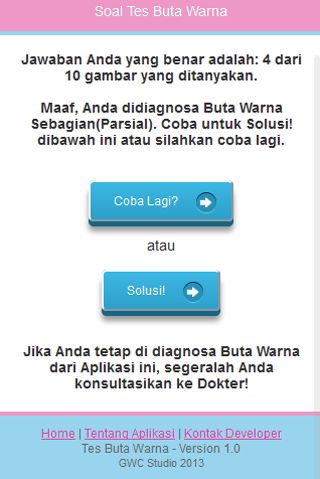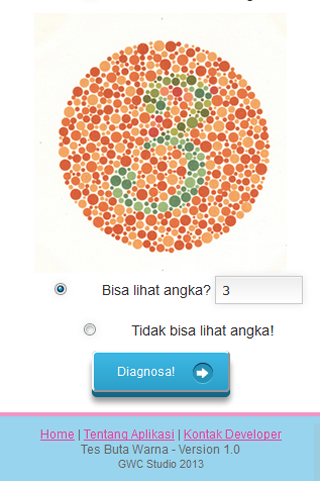 Dalam aplikasi ini dilakukan pengetesan layaknya sebuah buku tes buta warna untuk menjawab 10 gambar yang muncul dan apabila terjawab benar semua maka akan menghasilkan diagnosa bahwa tidak mempunyai kelainan buta warna. Sedangkan apabila terdapat jawaban yang salah maka akan didiagnosa mempunyai kelainan buta warna. Cobalah melakukan pengetesan berulang-ulang dan apabila Anda tetap belum dapat menjawab semua gambar dengan benar, segera konsultasi ke dokter karena Anda kemungkinan mempunyai kelainan buta warna.