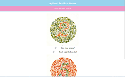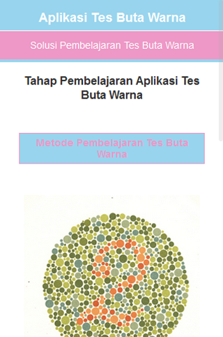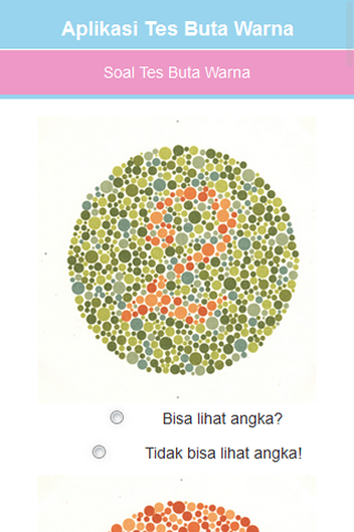 Aplikasi Tes Buta Warna ini merupakan screening hasil dari diagnosa pemakai apakah buta warna atau tidak. Berisi gambar acak dan masukan jawaban untuk menilai seseorang mempunyai kelainan buta warna atau tidak yang sesuai dengan buku Ishihara Asli. Data gambar dan jawaban selalu acak sehingga pengguna tidak mudah untuk menebak isi gambar. Aplikasi Tes Buta Warna ini simpel dan mudah untuk digunakan.