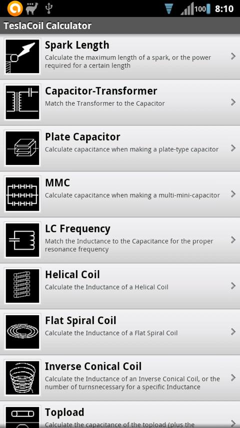 A great app to have when building a Tesla Coil! This calculates the necessary values for the various parts of a Tesla Coil, and makes life easy going.