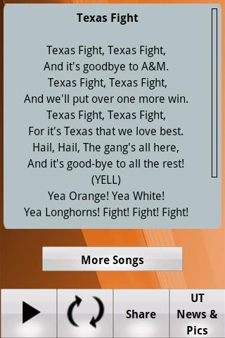 Experience the explosive power of Texas Gameday! Play the top Texas fight songs whenever & as LOUD as you want; at the pregame party, during the game, after a score, celebrate a victory, or taunt a rival. Includes MUSIC & LYRICS for “Texas Fight”, “The Eyes of Texas”, “Deep in the Heart of Texas”, “Wabash Cannonball” & top Texas logos. All content is officially licensed. Easy sharing link to friends on Facebook. It’s like bringing the band & cheerleaders with you! HOOK EM HORNS!