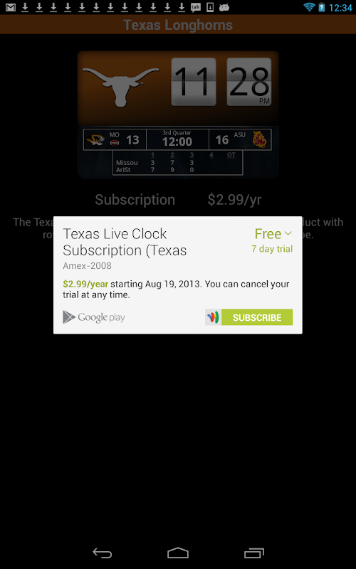 Subscription: This is an officially licensed product with royalties paid to the University of Texas. The $2.99 annual subscription is good for 12 months from date of purchase (after the free trial ends). If you don't like it, just cancel your subscription within 7 days and you won't be billed. To manage subscriptions, launch the Google Play Store app, then tap Menu > My Apps > Subscriptions.