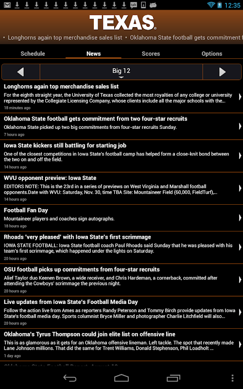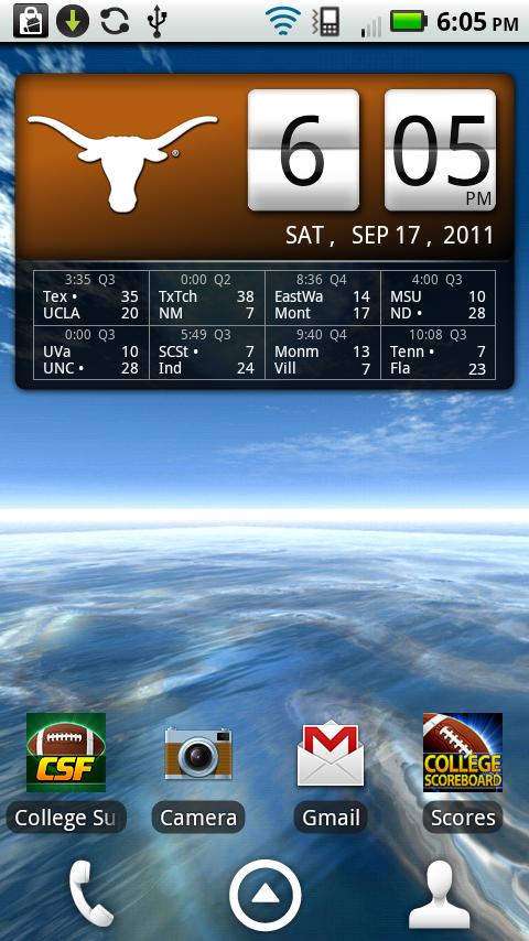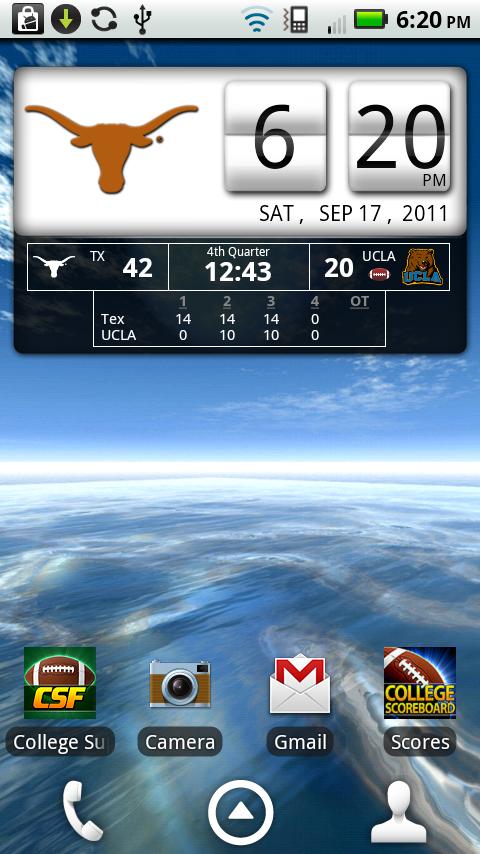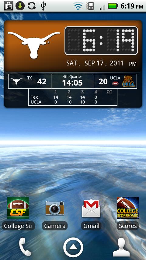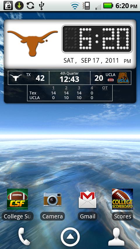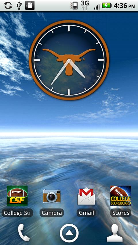 **7 Day Free Trial!** Official Texas Longhorns Live Clock, with college football and basketball scores below the clock when games are on. This widget lets you replace the standard clock in your phone with a custom Texas Longhorns clock, with instant access to Big 12 schedules, news and scores (as well as other conferences). You don’t even need to open the app to see live scores—they appear automatically during live games. When no games are on, you’ll see the latest Big 12 news headlines below the clock.