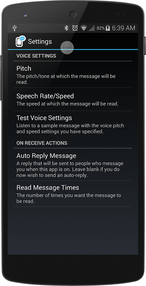 - Name Finder: If the text message's phone is in your contact list the person's name will be said instead of the phone number.