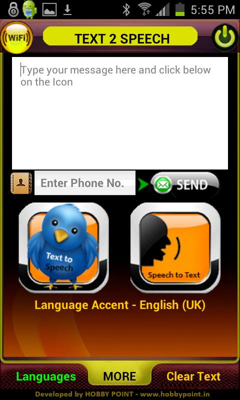 Make your phone say anything you want in many different languages accent. Supports English Language, German Language, Spanish Language, Italian Language, Dutch Language, French Language