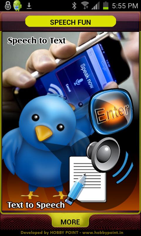 The Speech to Text app uses Androids built-in Speech Recognizer to turn speech into text which can be sent as an SMS Text Message.
