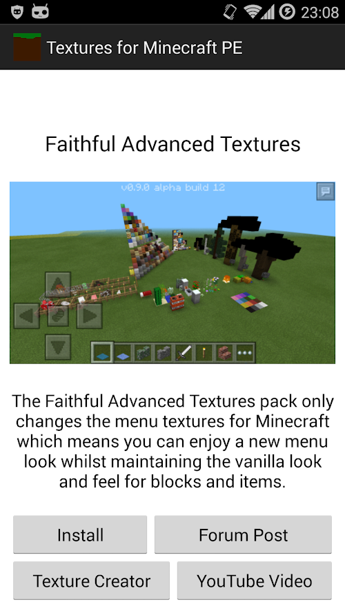Textures for Minecraft PE (Pocket Edition) allows you to apply texture packs to Minecraft Pocket Edition.