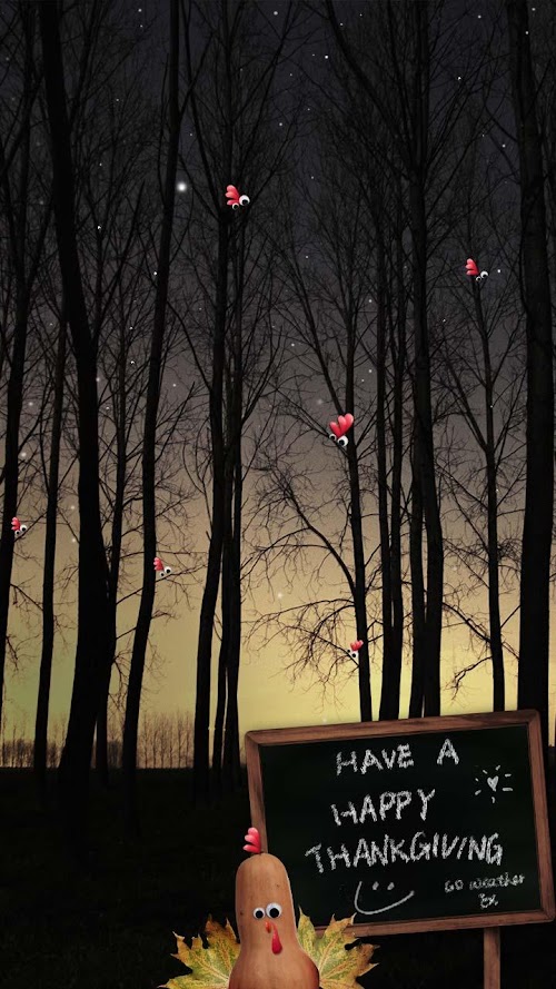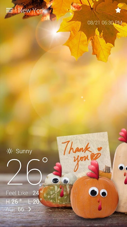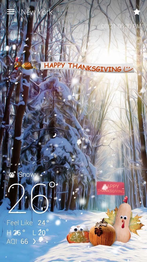 Thanksgiving Special, "Happy Turkey‘s Day", weather-reflecting in-app dynamic backgrounds. It displays dynamic backgrounds for 7 weather conditions, sunny/ rainy/ snowy/ thunder/ cloudy/ overcast/ foggy,  with day/ night visions. It's FREE.