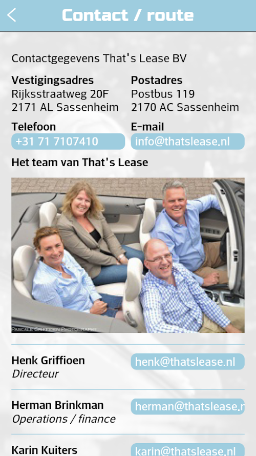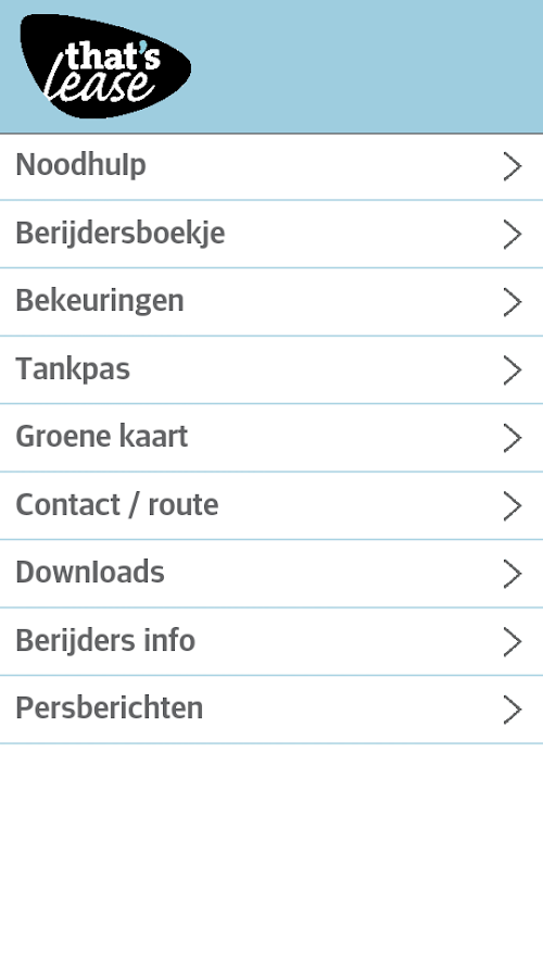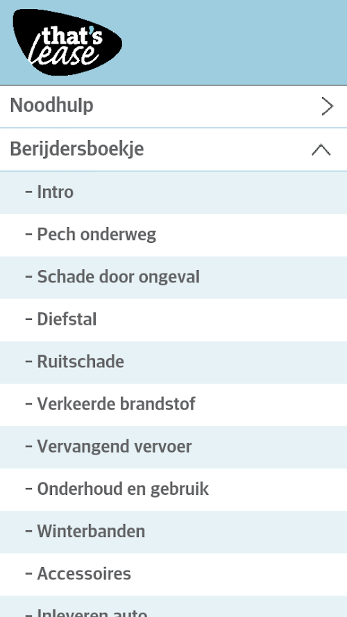 Onderweg hulp nodig? Schade? Barst in de ruit? Onderhoud plannen of banden wisselen? Alle informatie direct bij de hand. Hiermee krijgen de berijders van een That’s Lease auto in alle situaties de juiste instructies en informatie. Alleen bedoeld voor de berijders van een That’s Lease auto.Along help? Damage? Crack in the window? Maintenance switch plans or tires? All the information at hand. This get riders of That's Lease car in all situations proper instructions and information. Only for the riders of That's Lease car.