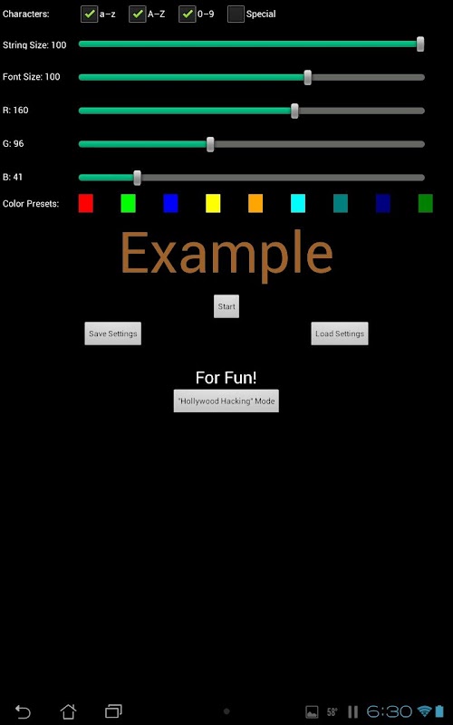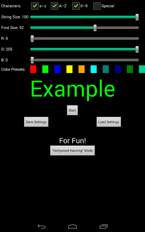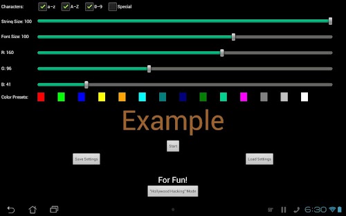 And just for fun, play around with the "Hollywood Hacking" Mode which will either use a random string or a password you enter, up to 20 characters, and then 'solve' the password by randomly trying different characters.