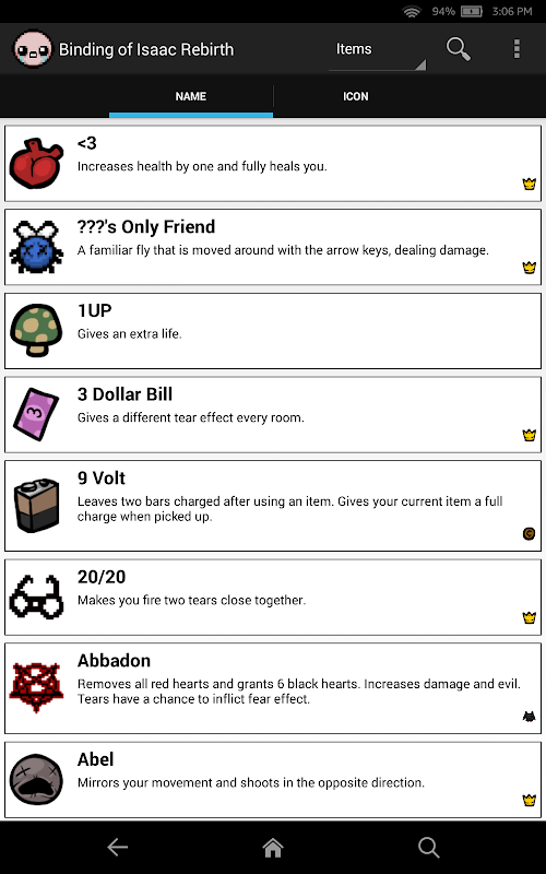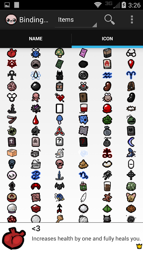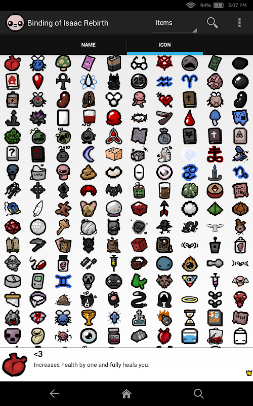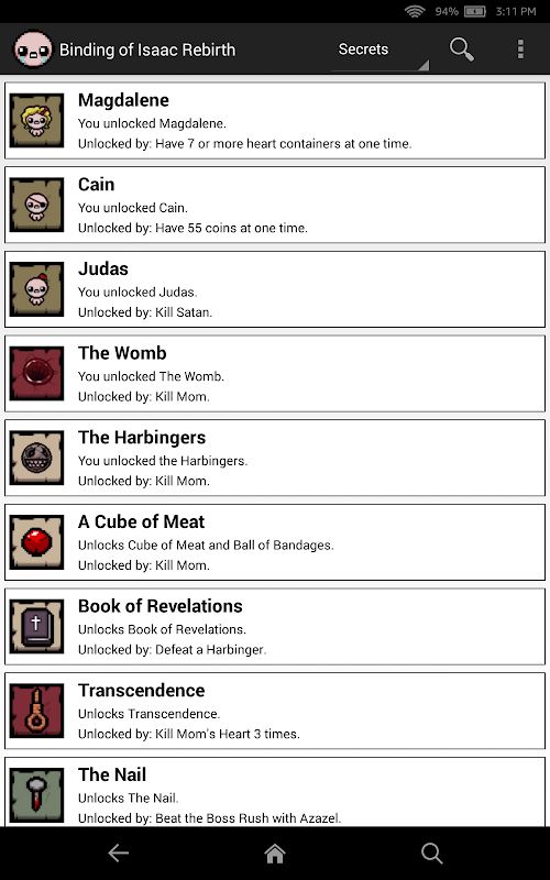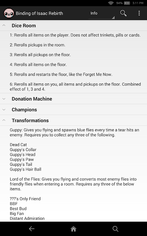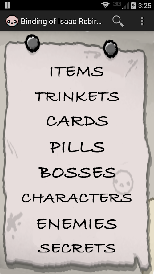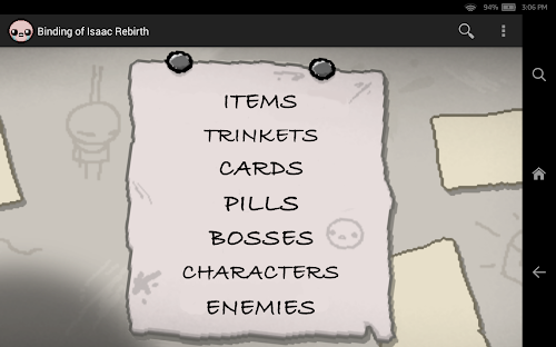 This app is NOT the game. This app is a reference guide for Rebirth, and is not in any way associated with or endorsed by Edmund or Nicalis. This app contains all the item, enemy, and boss information that can be tedious to memorize. Can't remember what that one tarot card does? Just look it up in this app.