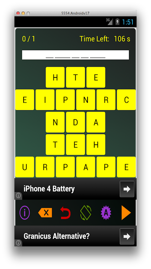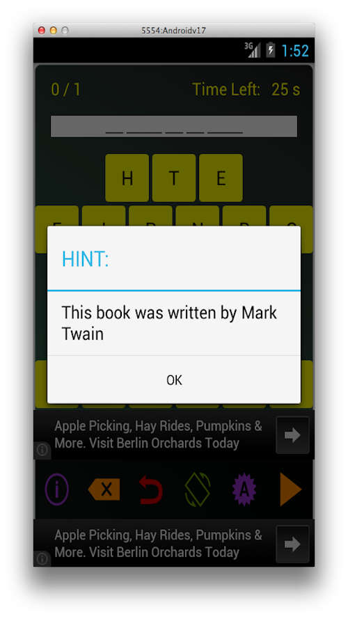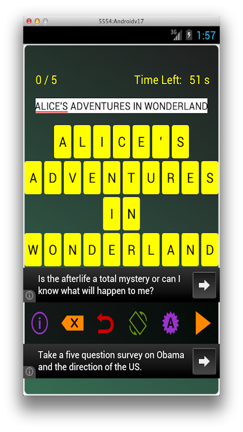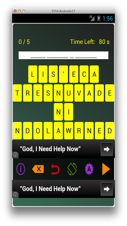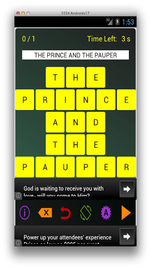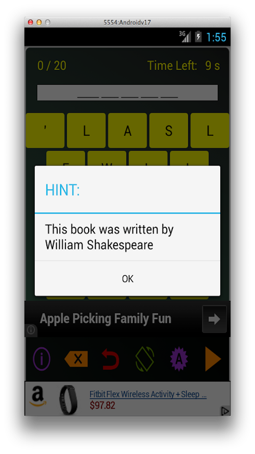 This is a super fun, highly addictive educational word game. The objective of this game is to solve a puzzle in which the letters of a book have been rearranged. The books are literary classics and range from Hamlet to Sherlock Holmes and everything in between ... ( and outside it as well ;-) ). You have to rearrange the letters in the right order and discover the book. The author of the book is given as a hint. If you guess the book correctly, you win ! You can also play with your buddies to see who is the brightest of all !