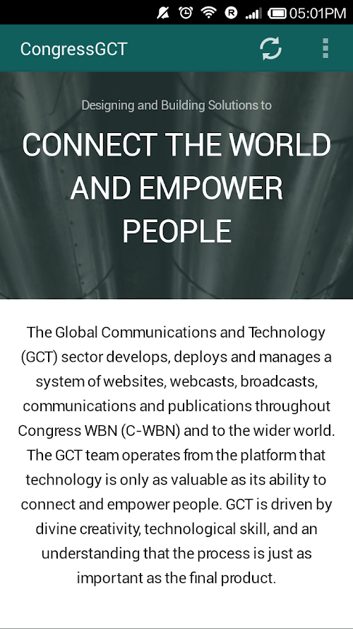 The Global Communications and Technology (GCT) sector develops, deploys and manages a system of websites, webcasts, broadcasts, communications and publications throughout Congress WBN (C-WBN) and to the wider world.