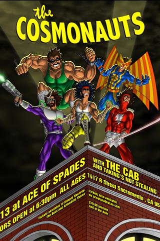 Since then, the band has come to develop the sound that defines them; and the members' musical synthesis produces a unique combination of voices and instrumentation with influences across genres and eras with a fresh sound unlike any other! The Atomic Fist brings to the table his dynamite lead vocals, with influences in classic and 80's rock. The Hellion writes and performs technical, energizing lead guitar riffs with intricate solos that provide the intensity in The Cosmonauts' driving sound. Red Lightning brings the melodic low end of the sound, with walking bass lines and driving accents. Gibraltar plays the beat for this superhuman sound, with an equally superhuman presence in his on-stage theatrics! Captain Neptune cuts the air with his dynamic synthesizer parts, and lights the air with his stage hype and antics.