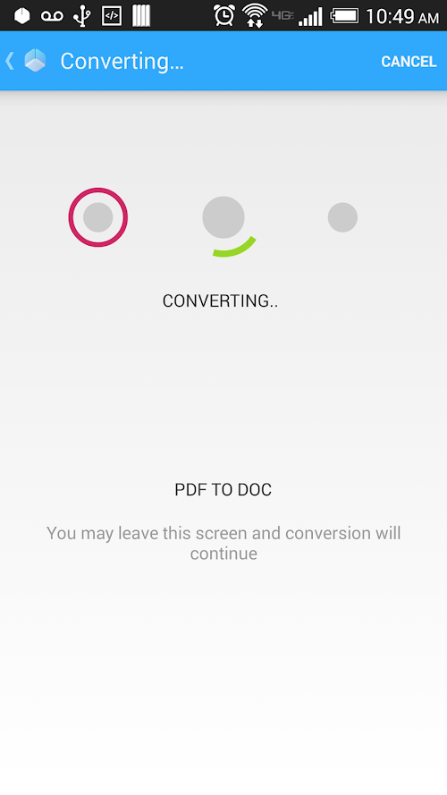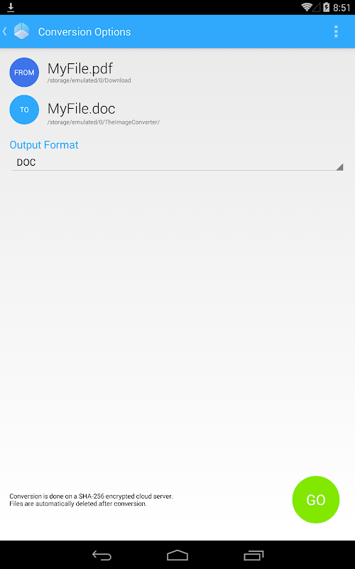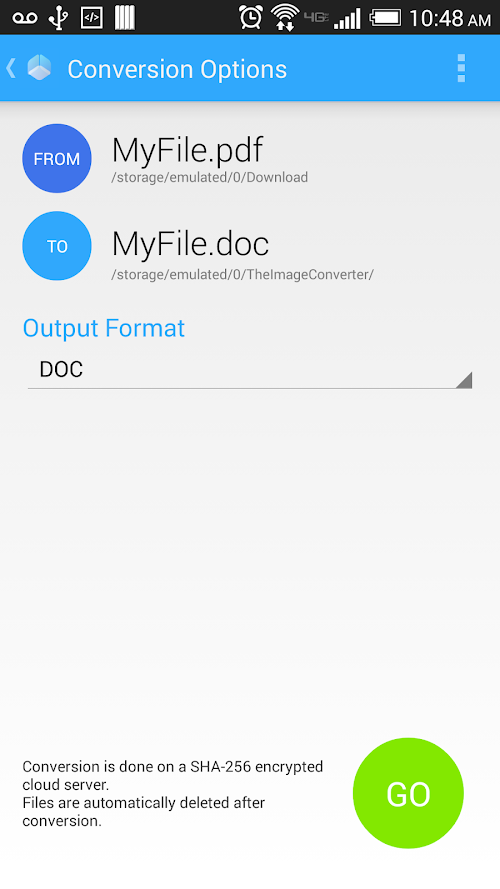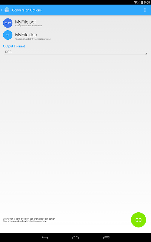 Note: Your files will be sent to an SHA-256 encrypted, secure conversion server for conversion. While the files are encrypted, and immediately deleted after conversion or cancellation, you should be aware that by using this app, you agree that your files are sent over to internet to the conversion server.